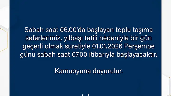 Elazığ Belediyesi, otobüs saatlerinde yılbaşı tatili nedeniyle güncelleme yaptı. Belediye tarafından yapılan duyuruya göre sadece 01.01.2026 Perşembe günü geçerli olacak şekilde sabah 06.00'da başlayacak olan otobüs seferleri 07.00'de başlayacak.
