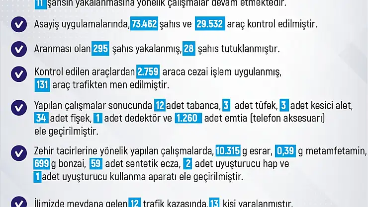 Elazığ Valili Asayiş Bültenine göre, yakalanan şahıslardan 10’unun tutuklandığı, 11 şahsın ise yakalama çalışmalarının devam ettiği belirtildi. Güvenlik güçleri tarafından yapılan asayiş uygulamalarında dikkat çeken rakamlar ortaya çıktı; toplamda 73 bin 462 şahıs ve 29 bin 532 araç kontrol edildi.