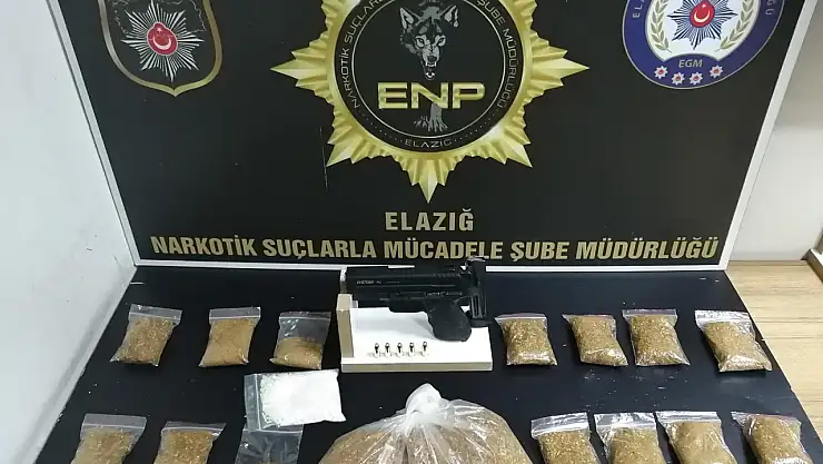 Elazığ Cumhuriyet Başsavcılığı koordinesinde İl Emniyet Müdürlüğü Narkotik Suçlarla Mücadele Şube Müdürlüğü tarafından, uyuşturucu ile mücadele kapsamında uyuşturucu madde kullanan şahıslara ve sokak satıcılarına yönelik operasyon gerçekleştirildi. Yapılan operasyonda piyasaya sürülmek üzere 15 parça halinde 696,52 gram tütüne emdirilmiş kannabinoid maddesi, 4 parça halinde 25,33 gram metamfetamin maddesi, 1 adet ruhsatsız tabanca ve tabancaya ait 5 adet fişek ele geçirildi.