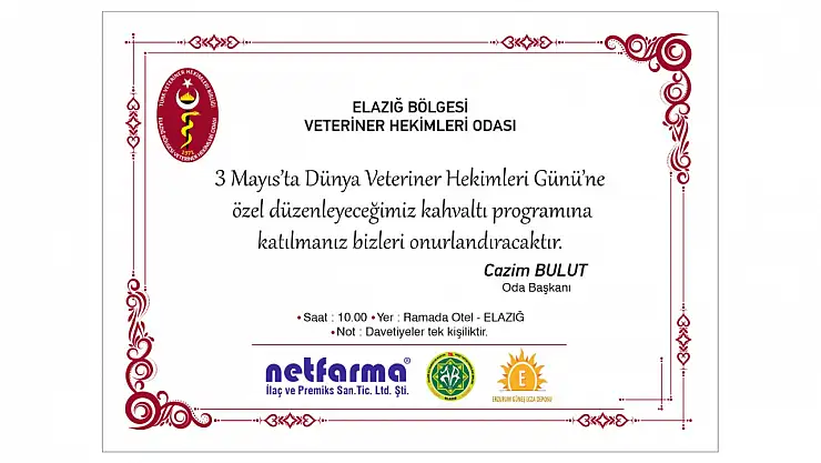Elazığ Bölgesi Veteriner Hekimleri Odası, 3 Mayıs Dünya Veteriner Hekimleri Günü dolayısıyla özel bir kahvaltı programı düzenliyor. Ramada Otel'de saat 10.00'da başlayacak olan programa veteriner hekimlerin yanı sıra davetliler de katılacak.